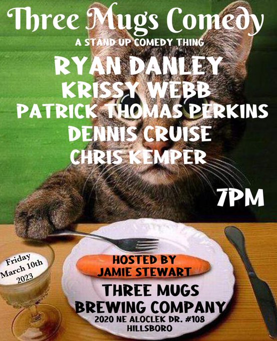| Three Mugs Comedy | 2026-01-03 7:00PM (Saturday) | 2020 NE Aloclek Dr Ste 108 Hillsboro | Three Mugs Brewery | Monthly | Showcase - Family | Our monthly comedy show hosted by Jamie Stewart. |