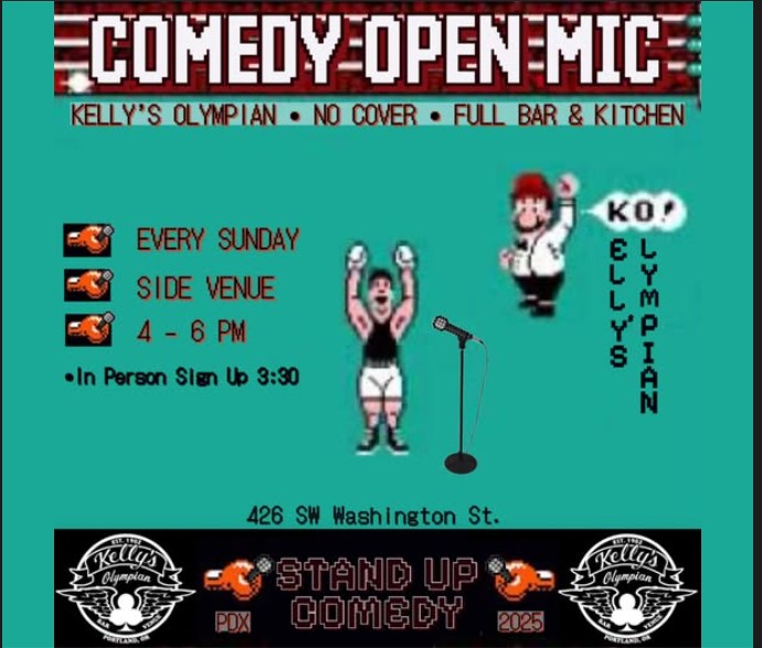 | Kellys Comedy Sunday | 2026-01-04 4:00PM (Sunday) | 426 SW Washington Portland, OR | Kellys Olympian | Weekly | Open Mic - Adult | Signups at 3:30pm |
