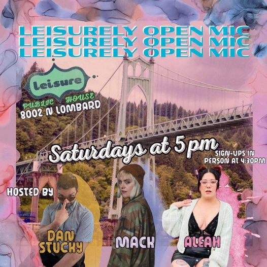 | Leisurely Open Mic | 2026-01-03 5:00PM (Saturday) | 8002 N. Lombard Portland, OR | Leisure Public House | Weekly | Open Mic - Adult | Signups Start at 4:30pm |