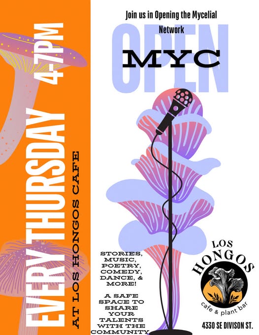 | Los Hongos Open Myc | 2026-04-16 4:00PM (Thursday) | 4330 SE Division St Portland,Or | Los Hongos Cafe and Plant Bar | weekly | Open Mic - Adult | Mixed Mic |
